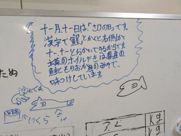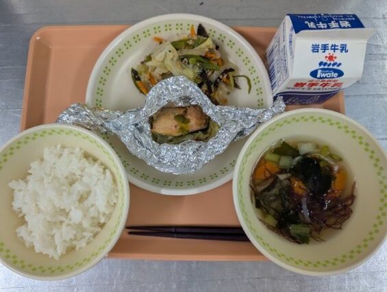 11月11日は「鮭の日」です。岩手で獲れる鮭は「南部さけ」とも呼ばれ、その鮮度や食味の良さで有名です。そんな美味しい鮭を今日はホイル焼きにしました。盛岡産の味噌と合わせて、さらに美味しくなりました。写真には、給食委員会の子どもたちが書いたコメントも載せました。給食室前のホワイトボードに、献立に合わせてコメントやイラストをかいてくれています。