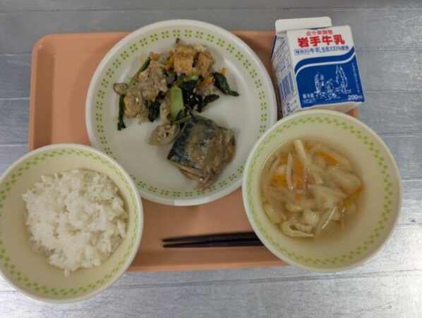 12/1 リクエストメニュー:麦ごはん、さばのみそ煮、こまつなのそぼろいため