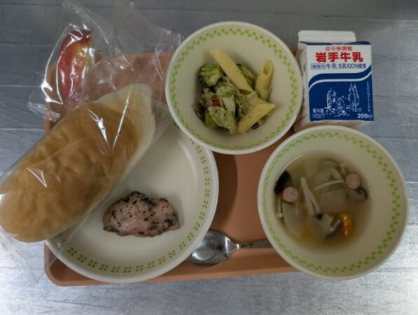 (コッペパン、牛乳、ペンネジェノバソテー、きのこのコンソメスープ、りんご)